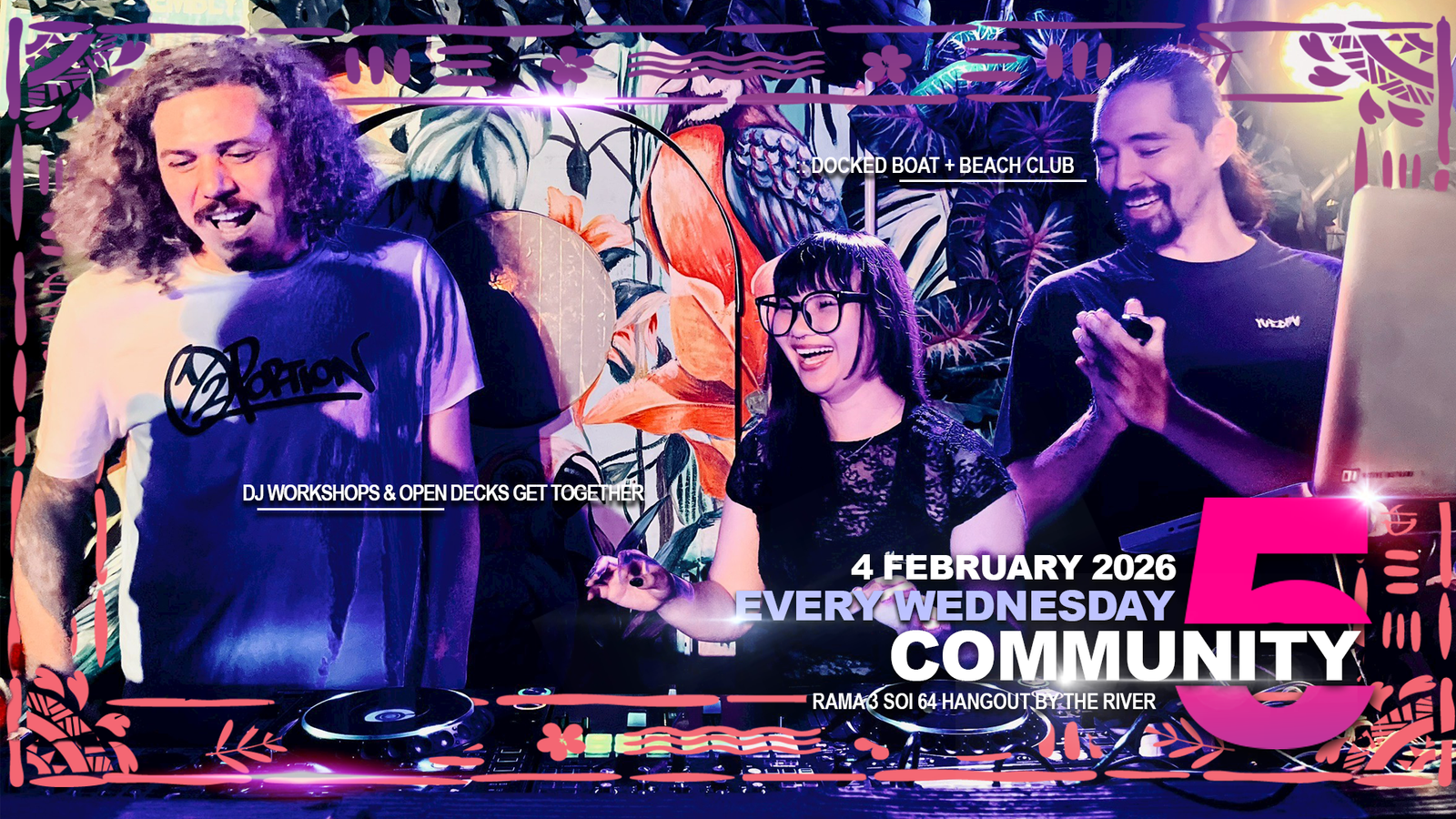 Community Wednesday is one of the most genuine “Community in Bangkok” nights you can find — not because it tries to be a big event, but because it gives people space to show up as they are. It’s not designed like a typical Bangkok event. It isn’t built around a headliner, a strict schedule, or a packed dancefloor expectation. Instead, it’s an open space where sound, people, and the river meet naturally, without pressure. It’s a midweek pause — a place to breathe, listen, connect, and sometimes create.