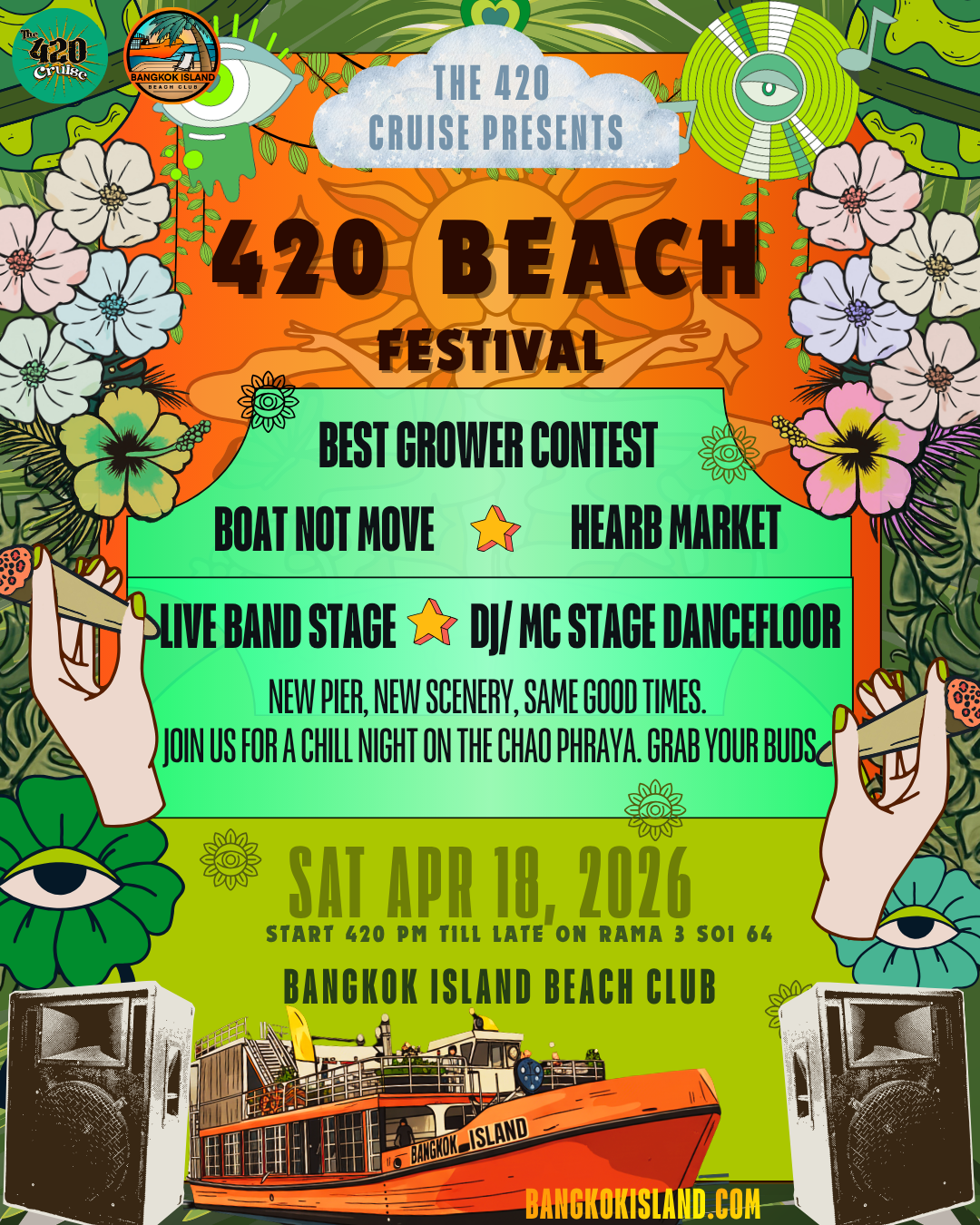 แม่น้ำกลายเป็นพื้นที่แห่งอิสระ แสงไฟเมืองสะท้อนผืนน้ำ ทุกอย่างดูมีชีวิตและพลังมากขึ้น จากเมืองคอนกรีตสู่บรรยากาศโอเพ่นแอร์ ผสมพลังธรรมชาติและวัฒนธรรม 420 อย่างเต็มรูปแบบ ที่นี่คือจุดรวมของสายชิล สายมัน และสายปาร์ตี้ตัวจริง ชวนเพื่อนสายเขียวของคุณมา รวมแก๊ง แล้วมาสนุกไปด้วยกัน