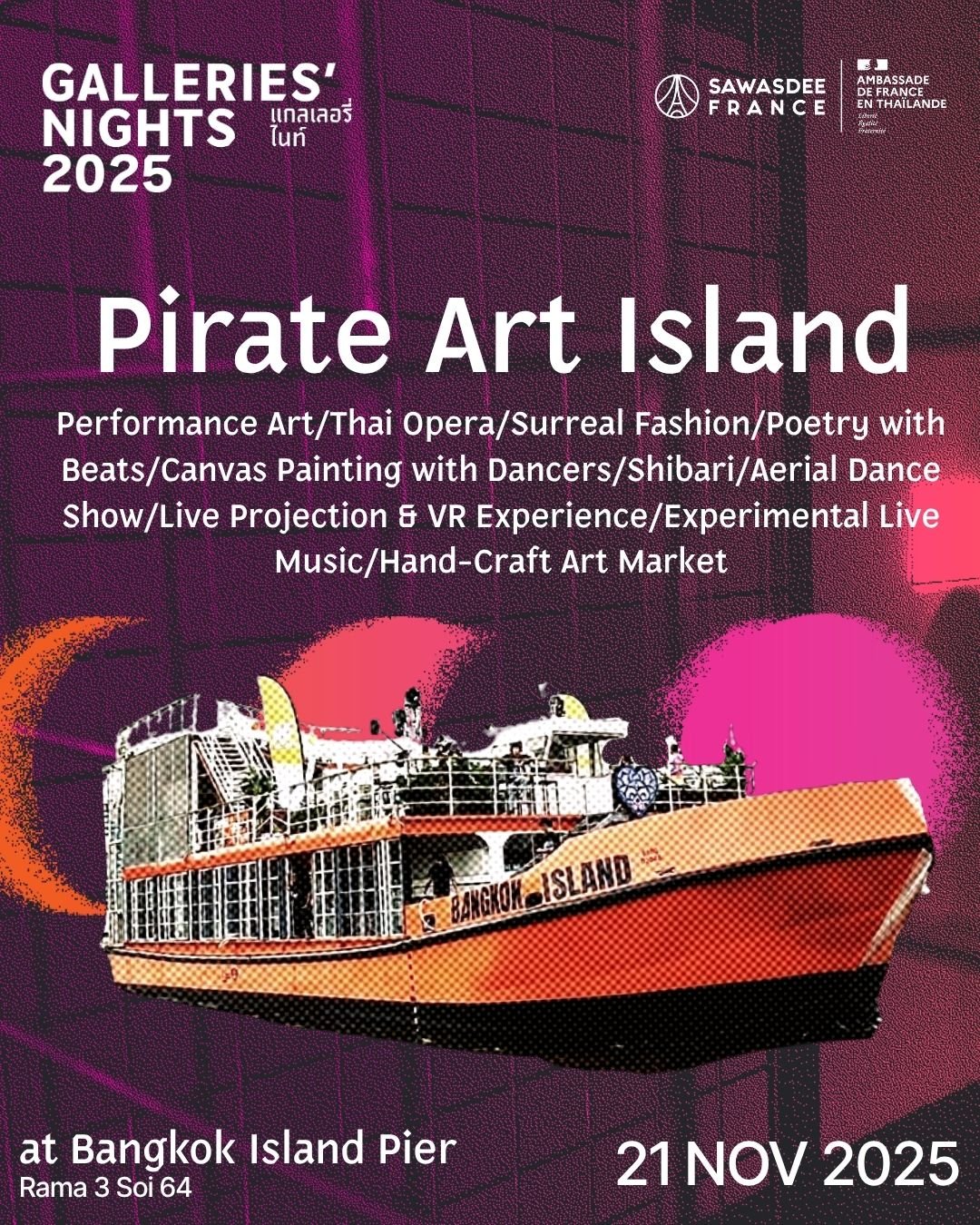 ในวันที่ 21 พฤศจิกายน Bangkok Island จะไม่ได้แล่น แต่จะถูกเทียบเรืออยู่กับสายน้ำ เหมือน “แกลเลอรีลอยน้ำ” ที่มีชีวิต — ที่นี่การแสดงจะไม่ใช่สิ่งที่อยู่แค่บนเวที แต่จะลอยอยู่ในอากาศ ระหว่างสายตาและร่างกาย การเต้นร่วมกับผืนผ้าใบ การเมืองของแฟชั่นที่ซ้อนทับกับความเหนือจริง บทกวีที่ถูกพาไปโดยจังหวะ บอดี้มูฟเมนต์ ศิลปะการแขวนตัวกลางอากาศ และเสียงดีเจที่ไม่ได้เล่นแค่เพลง — แต่เปลี่ยนอุณหภูมิ เปลี่ยนอารมณ์ เปลี่ยนความเร็วของค่ำคืน นี่ไม่ใช่ปาร์ตี้ — นี่คือ “งานศิลปะที่มีชีวิต” ที่คุณก้าวเข้าไปข้างใน