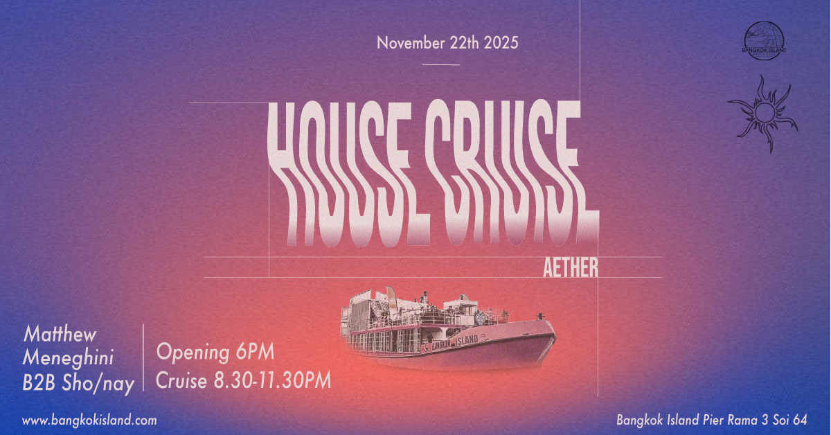 จัดบนเรือปาร์ตี้ Bangkok Island ที่เป็นเอกลักษณ์ของเมือง งานนี้ผสมผสานดนตรีอิเล็กทรอนิกสุดลุ่มลึก การล่องเรือชมวิว และซาวด์ดีไซน์ที่คัดสรรมาอย่างประณีต ให้ความรู้สึกเหมือนอยู่ในหนังหนึ่งเรื่อง — ทั้งหมดนี้คือค่ำคืนที่โดดเด่นเหนือปาร์ตี้ทั่วไปในกรุงเทพฯ.